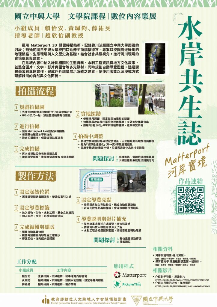 簡介: 數位內容策展課程期中Matterport專案,拍攝地點為學校周圍之綠川部分河段,加入文字、語音、圖片、影片及其他相關素材,並搭配VR設備觀賞。也邀請高齡者及社區民眾體驗,一起以不同方式認識生態及水利工程。