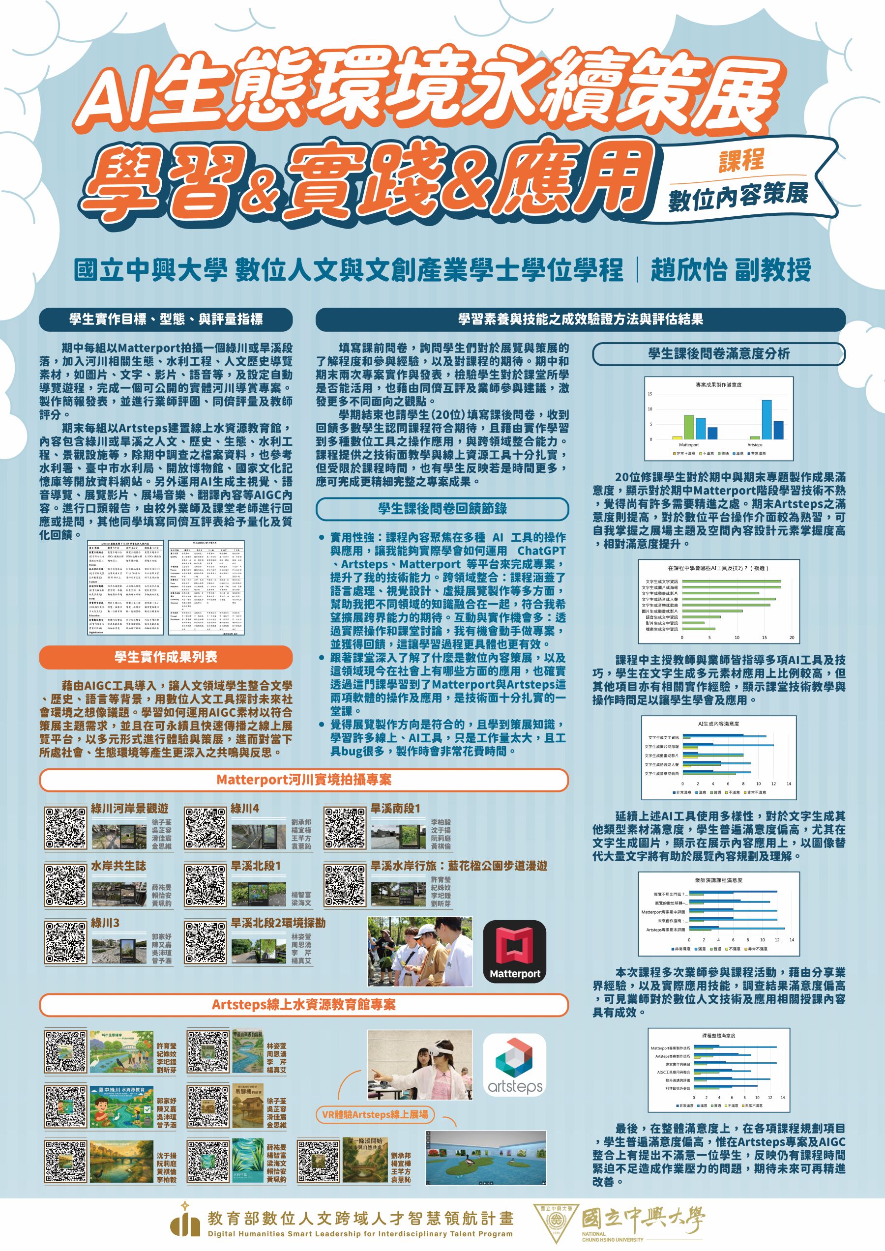 由國立中興大學趙欣怡副教授帶領「AI 生態環境永續策展:學習、實踐與應用」課程運用生成式 AI、Matterport 3D建模與 Artsteps線上策展,引導學生探究生態與永續議題,完成虛擬實境展示與水資源教育館線上展覽。學生掌握數位策展、環境觀察與跨平台整合能力,成果具創意與社會應用價值,展現AI跨域教學卓越成效。
