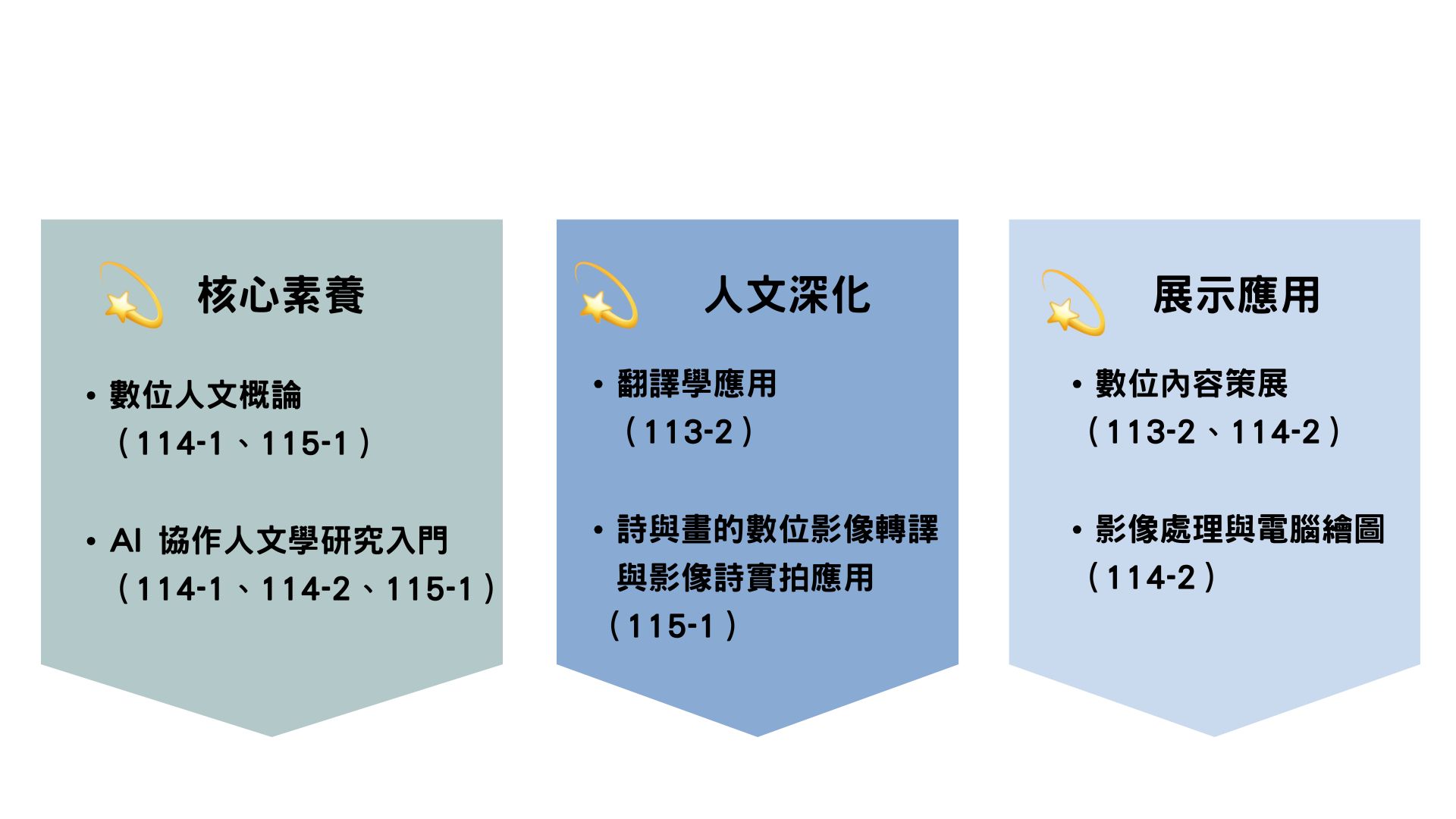 「數位內容策展」及「翻譯學應用」已於113學年度第2學期開設完成。「AI協作人文學研究」及「數位人文概論」於114學年度第1學期開設完成。「詩與畫的數位影像轉譯與影像詩實拍應用」及「影像處理與電腦繪圖」預計於114學年度第2學期及115學年度第1學期開設。